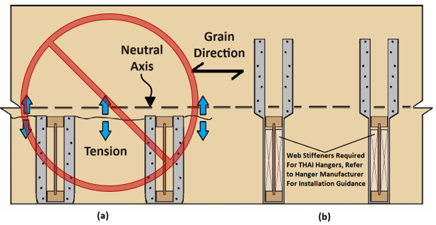 Wood's strength varies based on the direction of the load relative to the grain orientation. Typically, wood can resist greater stress when loaded parallel to the grain rather than perpendicular to it. The National Design Specification® (NDS) for Wood Construction advises against designs that induce tension perpendicular to the grain due to its minimal resistance to such stress. Engineered wood products like Trus Joist® Parallam® PSL, Microllam® LVL, and Timberstrand® LSL are manufactured with their grain aligned parallel to the length of the member, offering no inherent advantage for resisting tension perpendicular to the grain. Proper design and detailing are essential to prevent tension perpendicular to grain loading situations, which can lead to sudden and unexpected failures. Tension perpendicular to the grain can cause non-ductile failures, posing significant structural risks. Such failures can occur without warning, potentially leaving occupants unaware of impending issues. To mitigate these risks, it is recommended to place fasteners above the neutral axis using taller hangers or reinforce the supporting beam with an engineer's assistance.