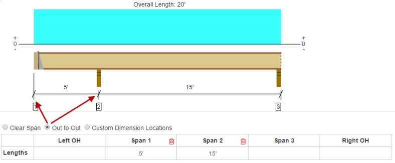 - Clear Span: Sets dimension locations at the inside faces of end supports and intermediate supports.