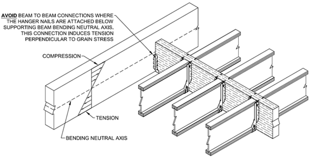 Wood's strength varies based on the direction of the load relative to the grain orientation. Typically, wood can resist greater stress when loaded parallel to the grain rather than perpendicular to it. The National Design Specification® (NDS) for Wood Construction advises against designs that induce tension perpendicular to the grain due to its minimal resistance to such stress. Engineered wood products like Trus Joist® Parallam® PSL, Microllam® LVL, and Timberstrand® LSL are manufactured with their grain aligned parallel to the length of the member, offering no inherent advantage for resisting tension perpendicular to the grain. Proper design and detailing are essential to prevent tension perpendicular to grain loading situations, which can lead to sudden and unexpected failures. Tension perpendicular to the grain can cause non-ductile failures, posing significant structural risks. Such failures can occur without warning, potentially leaving occupants unaware of impending issues. To mitigate these risks, it is recommended to place fasteners above the neutral axis using taller hangers or reinforce the supporting beam with an engineer's assistance.
